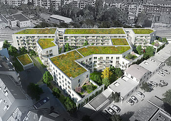 Entlang der Bahnlinie wird die Bebauung als Lärmschutz fungieren. Hiervon wird der Blockinnenbereich und die gesamte umliegende Nachbarschaft profitieren. Es wird ein Mehrwert für die gesamte Umgebung geschaffen.